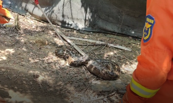 消防員立即與區(qū)公安分局、區(qū)自然資源局相關(guān)工作人員緊密配合:由公安部門維護(hù)現(xiàn)場秩序,消防員利用捕蛇器進(jìn)行抓捕,區(qū)自然資源局接收,共同完成抓捕任務(wù)。