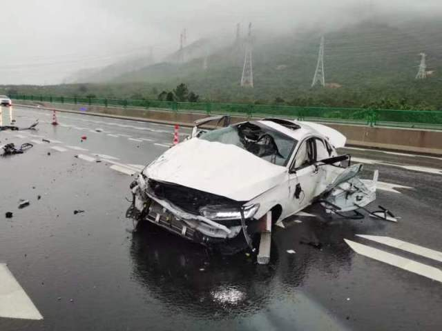 惠州市公安局交警支隊高一大隊警員進(jìn)行視頻巡查時,在G15沈海高速公路汕頭2790公里處發(fā)現(xiàn)一輛白色轎車損傷嚴(yán)重,橫放在路上,正值下雨天能見度降低,情況十分危急,隨即通知附近巡邏警力和救援單位趕赴現(xiàn)場處置,防止二次事故發(fā)生。