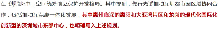 《規(guī)劃》提出空間統(tǒng)籌,確立保護(hù)開發(fā)格局。其中提到,先行先試推動(dòng)深圳都市圈區(qū)域協(xié)同合作,包括推動(dòng)深莞惠一體化發(fā)展,建設(shè)以“平湖+觀瀾+鳳崗+清溪+塘廈”為載體的產(chǎn)城協(xié)同一體化發(fā)展試驗(yàn)區(qū),與龍華共建面向深圳都市圈北部的綜合服務(wù)中心。與惠陽、大亞灣地區(qū)形成產(chǎn)業(yè)聯(lián)動(dòng)、交通緊密、配套齊全的協(xié)同發(fā)展格局。