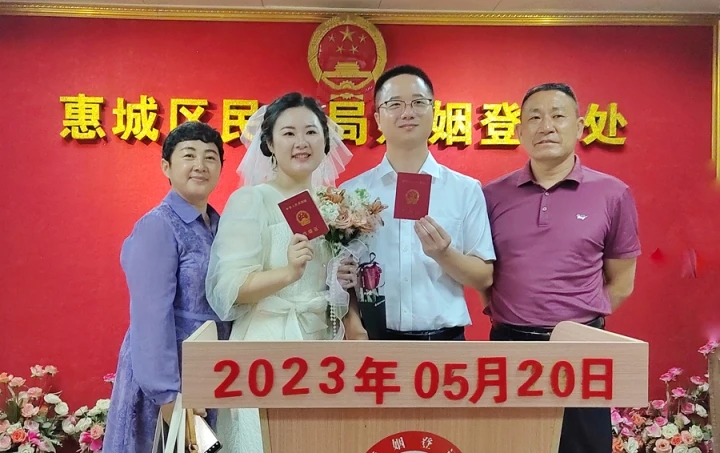 在惠城區(qū)婚姻登記處,(萬(wàn)先生)一對(duì)新人結(jié)婚登記領(lǐng)證后與父母親一起合影。