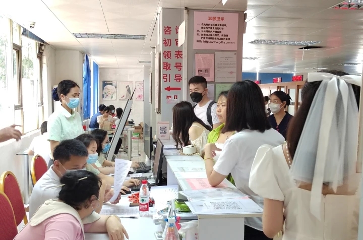 惠城區(qū)婚姻登記處排滿了前來(lái)登記結(jié)婚的新人。
