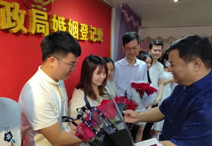 5月20日一大早,許多新人精心打扮,手捧鮮花挽手來(lái)到婚姻登記處,場(chǎng)面浪漫溫馨。
