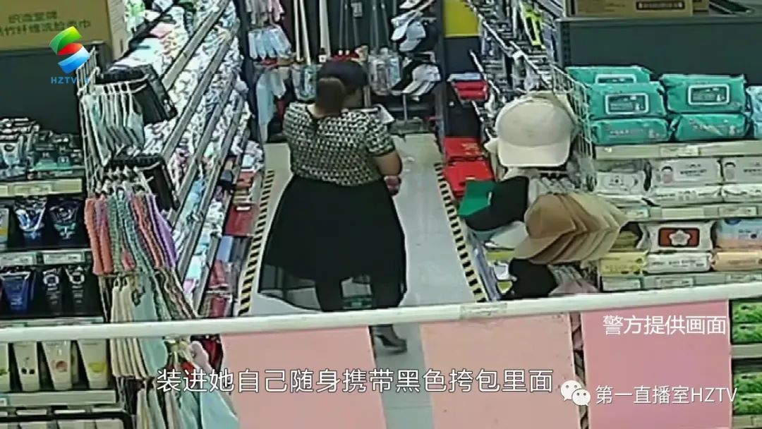 監(jiān)控顯示,事發(fā)當(dāng)天下午16點36分,一名黑衣女子出現(xiàn)在惠陽某超市內(nèi),她走走停停,眼睛一直在貨架徘徊,隨后她手里拿起一件藍(lán)色商品,在轉(zhuǎn)身瞬間,直接把商品塞進(jìn)隨身攜帶的手提包中。另外一邊,她又以同樣的手法,將肉和番茄塞進(jìn)包包中。