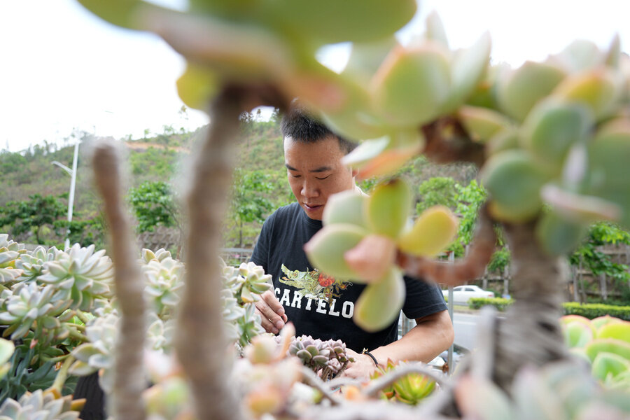 周逢平在摘除多肉的枯葉。