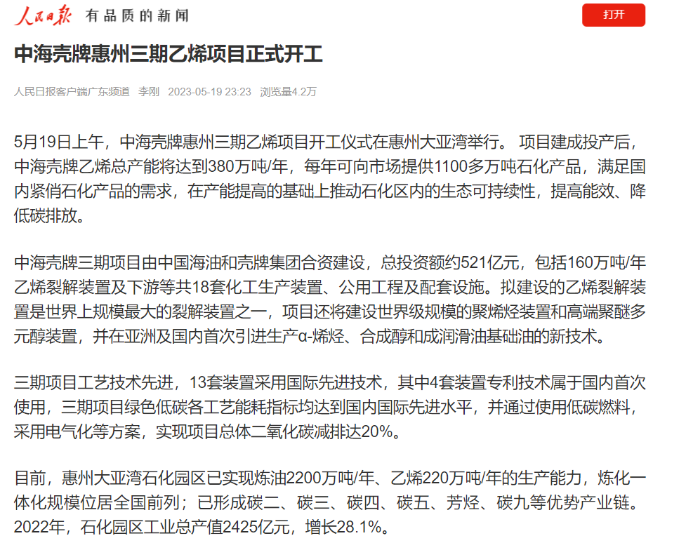 5月21日,南方日報頭版刊登題為《世界級灣區(qū)再迎世界級項目!中海殼牌惠州三期乙烯項目開工》的報道,南方日報、南方+記者還專訪了中海殼牌總裁唐令力,暢談項目建成后對惠州產(chǎn)業(yè)發(fā)展的影響以及未來將如何應對市場的競爭。