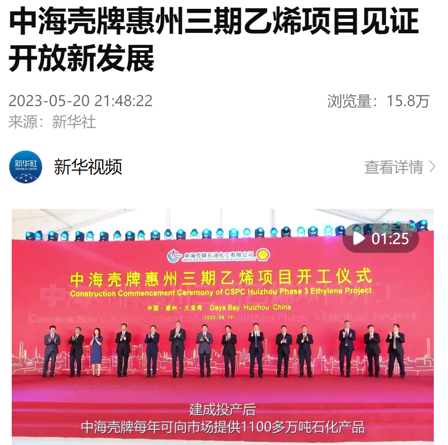 5月20日,新華社發(fā)布題為《中海殼牌惠州三期乙烯項目見證開放新發(fā)展》視頻,全面記錄和展示了開工儀式現(xiàn)場盛況,詳細報道了該項目的投資背景與發(fā)展前景,截至22日,視頻瀏覽量達15.8萬。