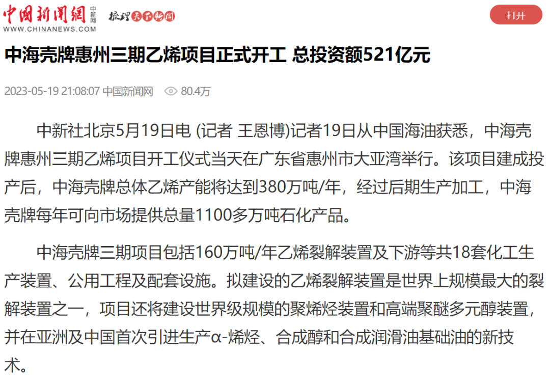 據(jù)統(tǒng)計,截至5月22日,全網(wǎng)超過600家媒體報道了中海殼牌惠州三期乙烯項目開工消息,媒體紛紛表示該項目是惠州與中國海油、殼牌集團互利合作,攜手打造世界級綠色石化產(chǎn)業(yè)高地的里程碑成果,充分展示了惠州堅持制造業(yè)當家、大項目帶動,全力聚焦實體經(jīng)濟推動高質(zhì)量發(fā)展的決心信心。