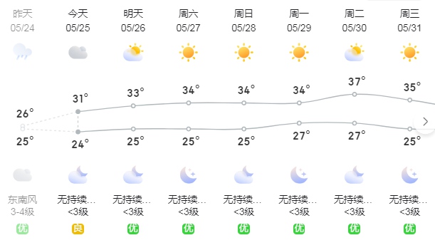 惠州日報訊 (記者周智聰)惠州市氣象臺5月24日發(fā)布一周天氣趨勢,預計5月25日,我市天氣多云,有陣雨或雷陣雨,氣溫24~31℃;26~27日,多云間晴天,局部有短時陣雨,氣溫25~33℃;28~29日,多云間晴天為主,天氣炎熱,氣溫26~35℃;展望30~31日,多云到陰天,有陣雨或雷陣雨。