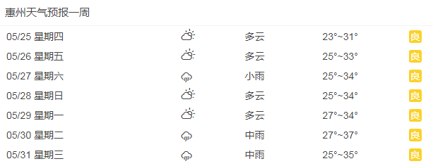 惠州方面,惠州市氣象臺(tái)昨日發(fā)布一周天氣趨勢(shì),預(yù)計(jì)5月25日,我市天氣多云,有陣雨或雷陣雨,氣溫24~31℃;26~27日,多云間晴天,局部有短時(shí)陣雨,氣溫25~33℃;28~29日,多云間晴天為主,天氣炎熱,氣溫26~35℃;展望30~31日,多云到陰天,有陣雨或雷陣雨。