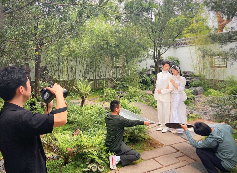 “這里場(chǎng)景豐富,北歐風(fēng)情、中式庭院、波希米亞風(fēng)格我都很喜歡,拍出意境。”新人小慧說,最初他們想旅拍婚紗照,受疫情影響沒有實(shí)現(xiàn),“在家門口就能拍出旅拍婚紗照,省去舟車勞頓和經(jīng)濟(jì)成本,很不錯(cuò)。”