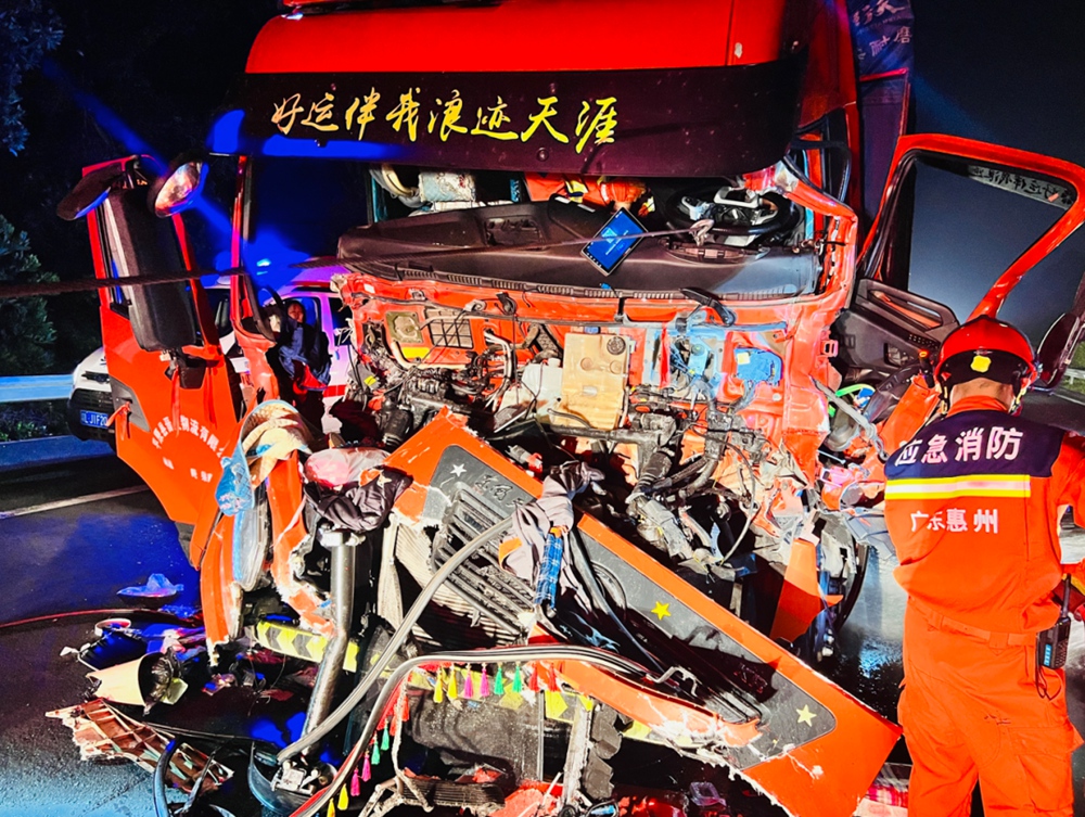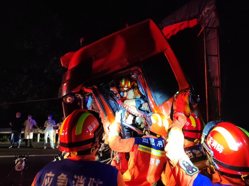 消防員到達(dá)現(xiàn)場后發(fā)現(xiàn)兩輛大貨車追尾相撞停在高速路邊,貨車車頭變形造成駕駛員被困在車內(nèi)無法活動(dòng).消防救援人員立即詢問被困人員身體情況,得知被困人下肢被變形車體卡住無法脫身,胸腔被變形方向盤壓迫導(dǎo)致身體不適。