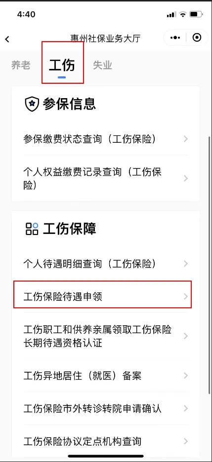 第二步:選擇“工傷”找到“工傷保險(xiǎn)待遇申領(lǐng)”。