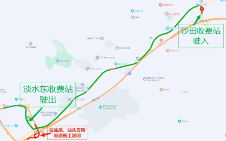 惠大高速經(jīng)淡水東互通轉(zhuǎn)沈海高速(往汕頭方向)車輛,可提前從淡水東收費站駛出,繞行228國道至沈海高速沙田收費站駛?cè)搿?