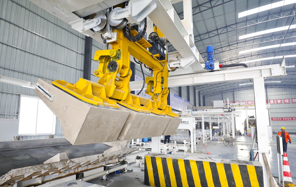 據(jù)介紹,該生產(chǎn)線包含鋼筋籠制作區(qū)、混凝土澆筑區(qū)、蒸汽養(yǎng)生區(qū)等六大功能區(qū),各區(qū)域由軌道串連成一個(gè)環(huán)形整體,區(qū)域間配備了機(jī)械臂、擺渡車和移動(dòng)小車,實(shí)現(xiàn)工序無(wú)縫銜接,從鋼筋籠到新澤西護(hù)欄成品,只需上車“走一圈”即可完成變身。