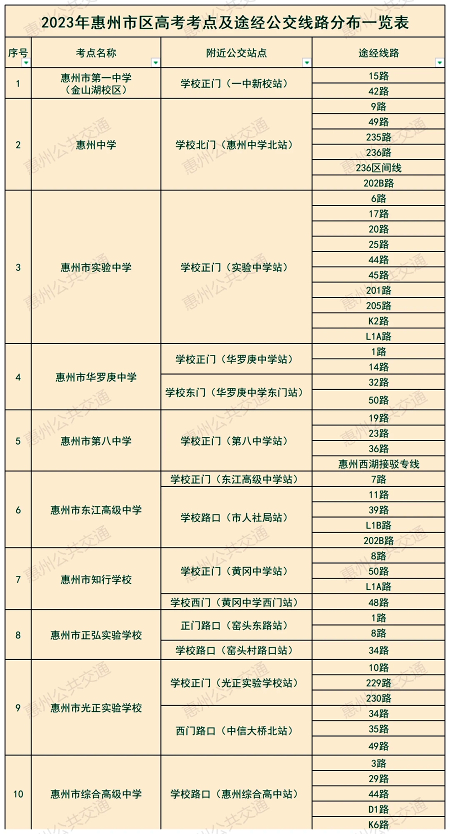 由于6月7日至9日,各科目考試開(kāi)始前10分鐘至考試結(jié)束時(shí)段,惠州市第一中學(xué)(東江學(xué)府)周邊體育南路(體校燈控至宿舍區(qū)門(mén)前路段)、惠州市第八中學(xué)周邊龍豐路東段、惠州中學(xué)周邊豐澤路及新力路東段等11個(gè)高考考點(diǎn)周邊道路禁止機(jī)動(dòng)車(chē)通行,以及在惠州市實(shí)驗(yàn)中學(xué)、惠州市知行學(xué)校、惠陽(yáng)中山中學(xué)、惠陽(yáng)區(qū)第一中學(xué)高中部、華南師范大學(xué)附屬惠陽(yáng)學(xué)校門(mén)前設(shè)置接送考生車(chē)輛專(zhuān)用通道,禁止其他車(chē)輛通行,該公司將對(duì)惠州市考場(chǎng)附近公交車(chē)輛視交警管制情況繞行。