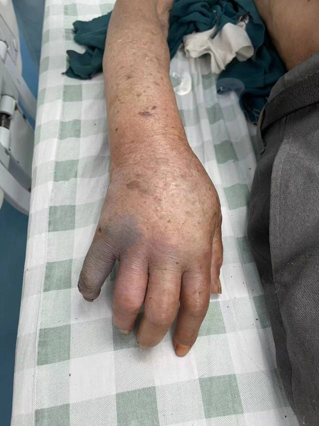 5月下旬,這名80多歲的患者余某(化名)被送往市一院蛇傷救治中心時(shí),距離其被毒蛇咬傷手指已經(jīng)過去整整一天。在此之前,余某在當(dāng)?shù)氐摹吧哚t(yī)”處用藥酒清潔了傷口,并在手上敷上了厚厚的草藥。