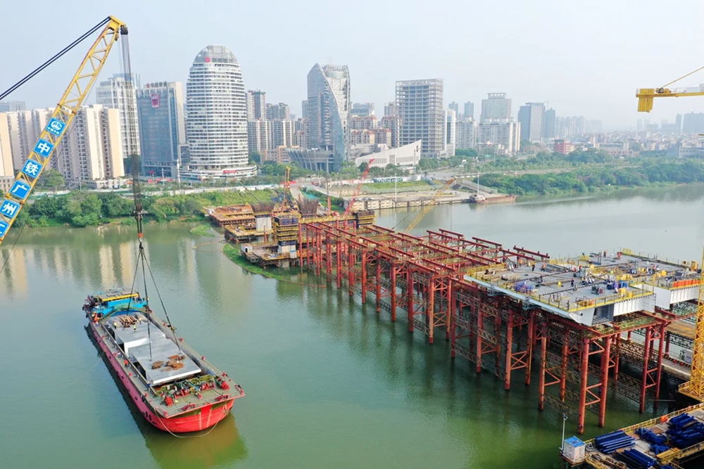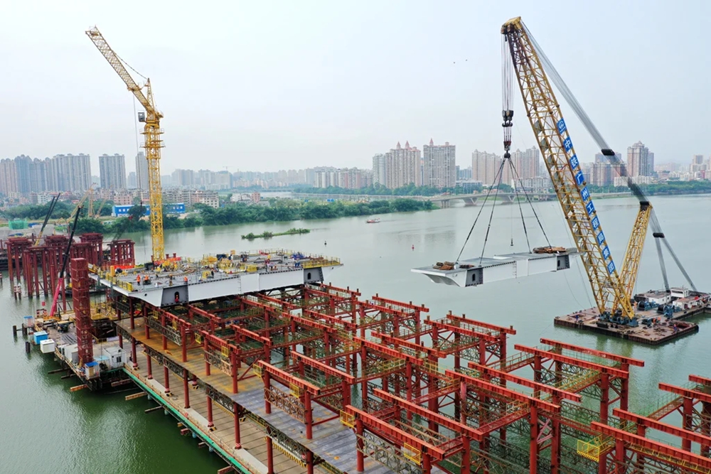 6月7日上午8時許,經(jīng)過鋼梁試吊、調(diào)整、預(yù)壓等工序后,中鐵廣州局鵝城大橋項目正式進入鋼梁架設(shè)階段,為明年建成通車奠定堅實基礎(chǔ)。