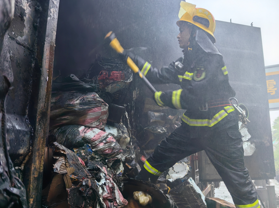 現(xiàn)場消防員發(fā)現(xiàn),被追尾的貨車裝載著滿滿的快遞,停靠在應急車道,濃煙滾滾,火勢相當猛烈,有明顯的燒焦味。而小轎車卡在貨車車尾,同樣燃燒猛烈。