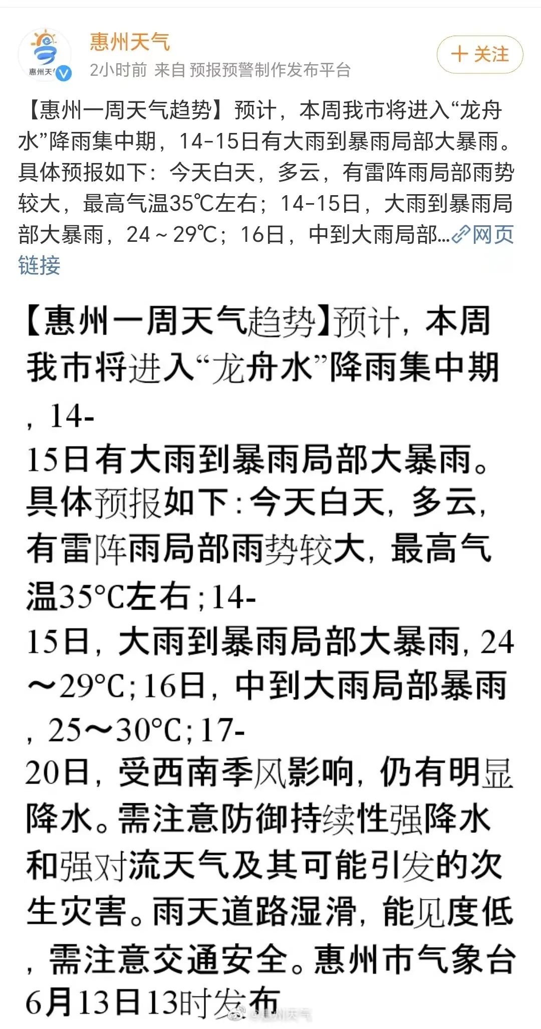 市氣象臺(tái)6月13日上午發(fā)布惠州重大氣象信息,預(yù)計(jì)本周我市進(jìn)入今年“龍舟水”降雨集中期,14~15日有大范圍大雨到暴雨,局部大暴雨,并伴有短時(shí)強(qiáng)降水、雷電和8級(jí)左右短時(shí)大風(fēng)等強(qiáng)對(duì)流天氣,全市平均雨量60~100毫米,局部150毫米以上;展望16~18日受西南季風(fēng)影響,仍有明顯降水。