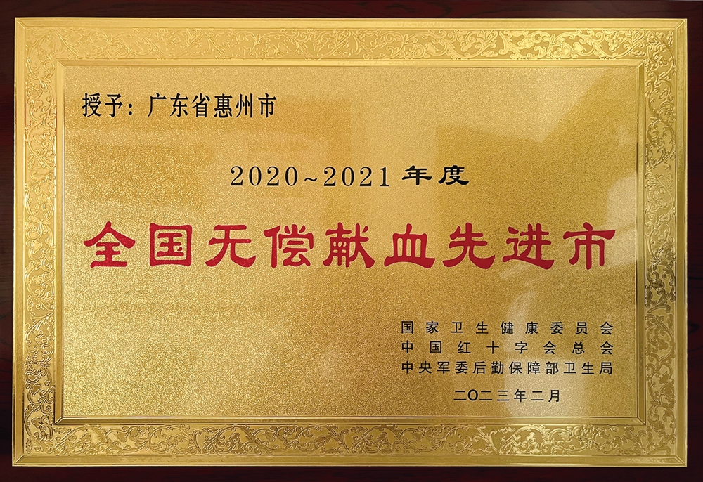惠州市獲評(píng)2020~2021年度全國(guó)無(wú)償獻(xiàn)血先進(jìn)市。市中心血站提供