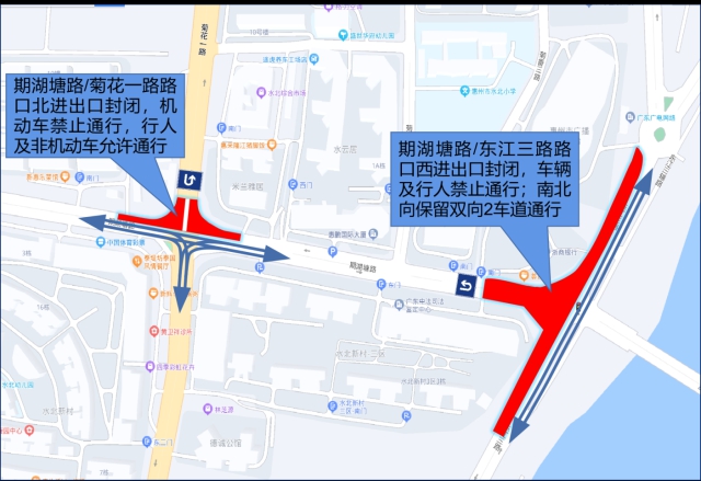 此外,根據(jù)鵝城大橋及引道工程建設施工需要,近期將圍蔽期湖塘路、菊花一路、東江三路部分車道。為確保施工期間道路交通安全、暢通、有序,市公安局交警支隊根據(jù)《中華人民共和國道路交通安全法》等有關法律法規(guī),將于6月17日至第一階段施工結束(第一階段工期約3個月),對施工路段實施臨時交通組織措施。