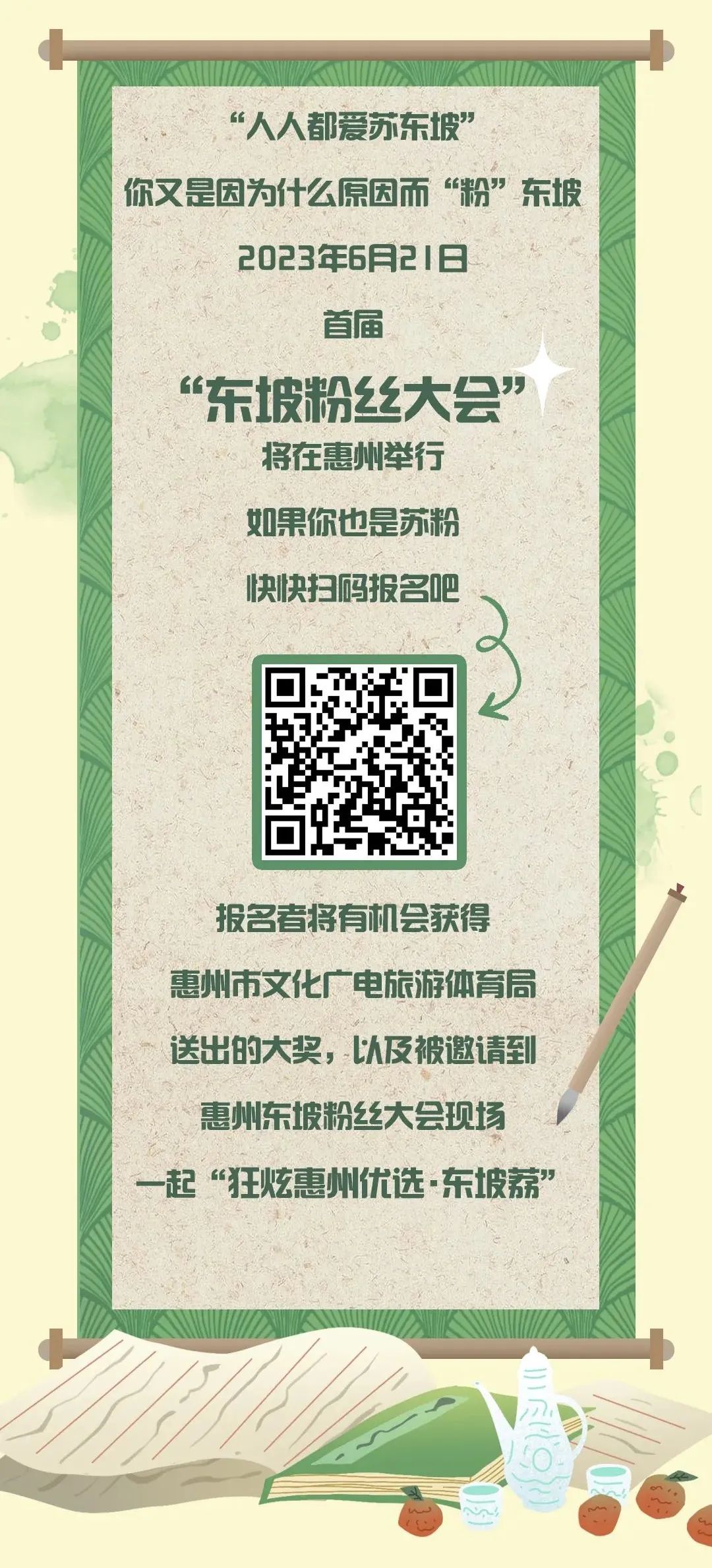 惠州日報(bào)訊 (記者龔妍)和北宋文豪蘇東坡來一場穿越千年的“約惠”。6月20~24日,首屆東坡粉絲大會暨2023惠州東坡文化旅游周活動將在惠州舉行。日前,活動主辦方通過南方都市報(bào)在線發(fā)布東坡粉絲召集令、尋找“最東坡”形象代言人。活動受到全國各地“東坡粉”的熱烈追捧,數(shù)百名“東坡粉”響應(yīng)號召,近百名網(wǎng)友參加“最東坡”形象代言人選拔活動。接下來,主辦方將結(jié)合報(bào)名者的朋友圈點(diǎn)贊數(shù)量、專家評審意見等因素,邀請7名東坡粉絲代表前來惠州參加6月21日在惠州文化藝術(shù)中心舉辦的粉絲大會,品東坡荔枝、游東坡游線。同時(shí),“最東坡”形象代言人也將由惠州日報(bào)社組織實(shí)地選拔,通過現(xiàn)場自我介紹、儀表展示、才藝展示、素質(zhì)展示四個(gè)環(huán)節(jié),權(quán)威認(rèn)證出“最東坡”形象代言人,邀請其參加粉絲大會并頒發(fā)榮譽(yù)證書。