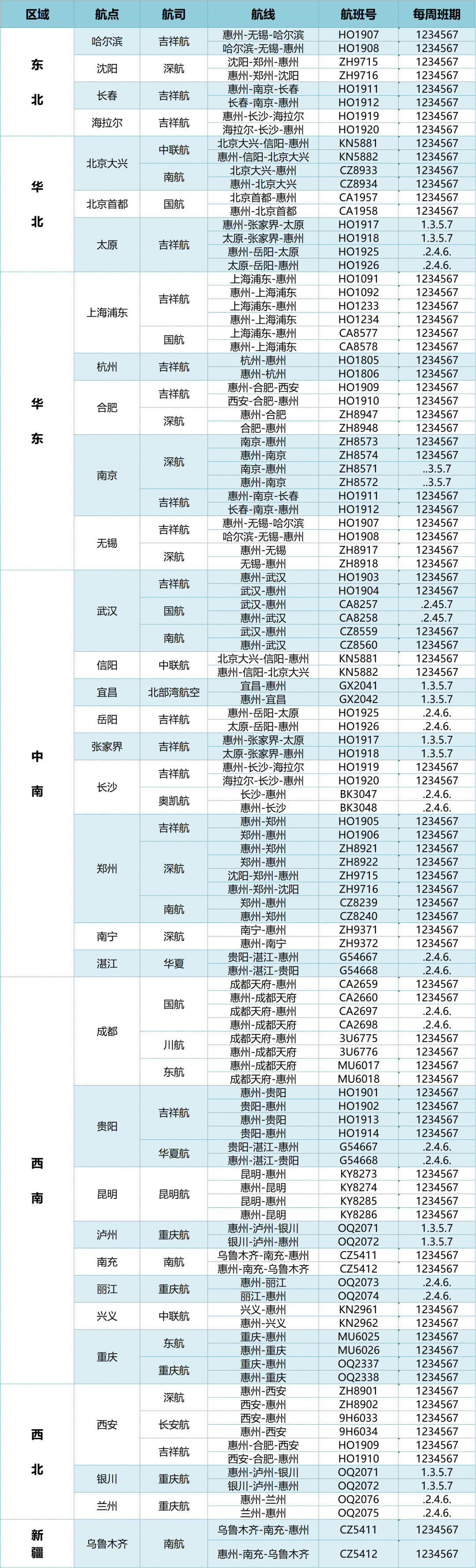 注:具體航班時刻以航空公司官網(wǎng)公布為準,可掃描惠州機場微信公眾號進行實時查詢。