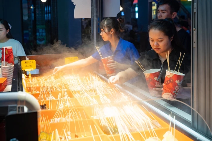 除了荔枝和漢服,集市上還有各類文創(chuàng)產(chǎn)品和非遺小吃的攤位。