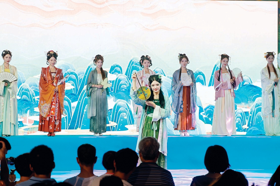 集市的漢服展示區(qū),展示著多種款式的漢服,吸引了許多人。身著各式漢服的小哥哥和小姐姐們優(yōu)雅地演繹著傳統(tǒng)禮儀,舞動華麗的袖子展示漢服的華美。