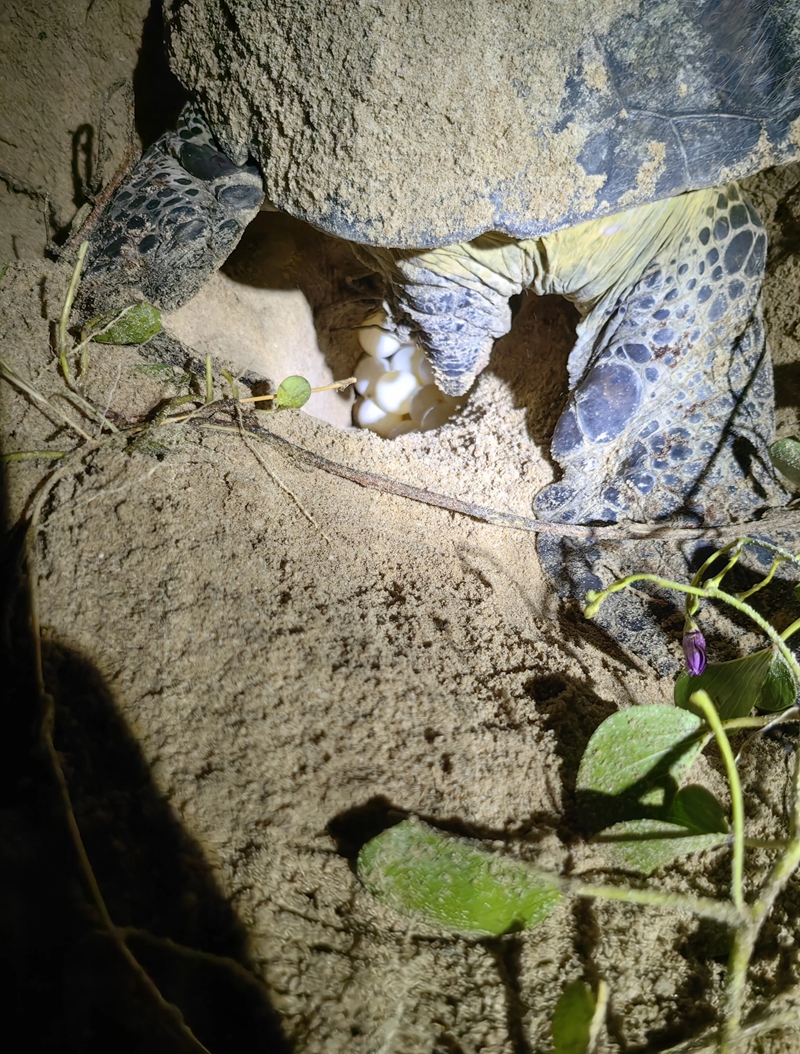 當(dāng)天凌晨,母海龜從海里悄悄爬上沙灘,用健壯的四肢在沙灘上挖了個坑,趴著產(chǎn)下一窩龜?shù)昂笥峙老蚝@铮?時30分消失在浪潮里。