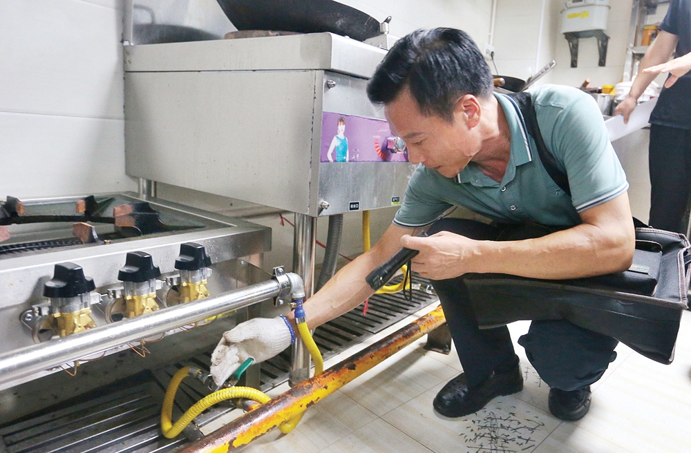 燃?xì)鈱<以跈z查餐廳的廚房的燃?xì)庠罴盃t灶。 惠州日報記者 朱金贊 攝