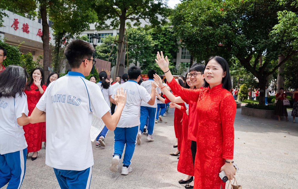 赴考前,惠州市綜合高級(jí)中學(xué)老師們?yōu)槊總(gè)學(xué)生送上寫有“金榜題名”的紅包,祝福他們考出好成績(jī)。在送學(xué)生們奔赴考場(chǎng)時(shí),老師們或穿旗袍,或披紅衣,希望孩子們旗開得勝,取得開門紅。