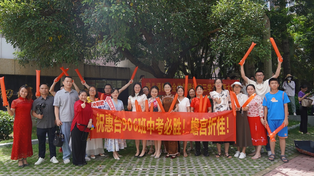 惠州市合生實(shí)驗(yàn)學(xué)校老師為考生鼓勁。