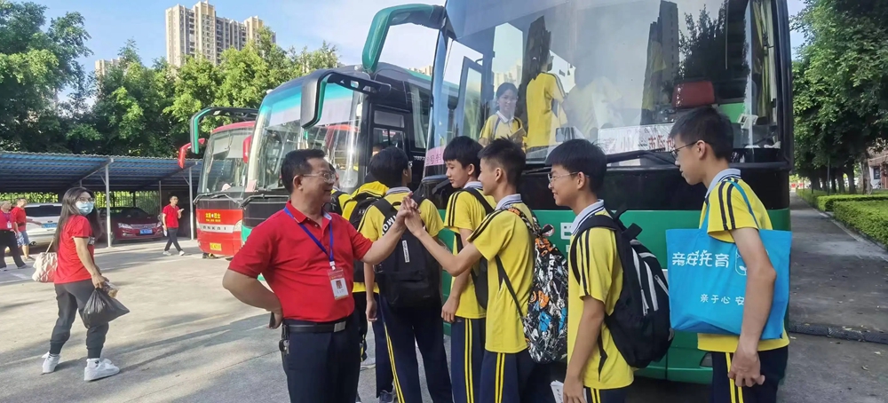 惠州市合生實(shí)驗(yàn)學(xué)校的考生們今年在惠州市惠城區(qū)尚書實(shí)驗(yàn)學(xué)校考點(diǎn)考試。昨日,學(xué)校特意安排了幾輛大巴車,將考生們集體送往考點(diǎn)。“加油!”出發(fā)前,學(xué)校領(lǐng)導(dǎo)和老師們統(tǒng)一身穿紅色衣服,排隊(duì)一一與每一位考生擊掌,為他們加油打氣。
