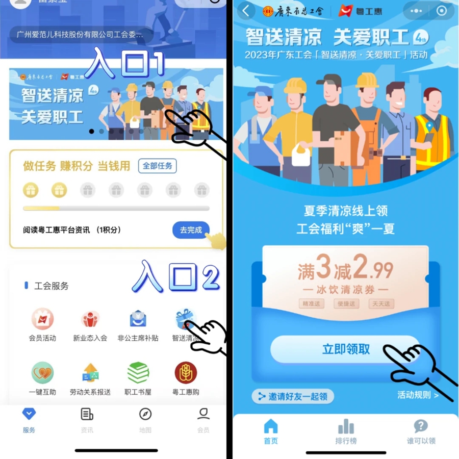第二步:授權(quán)登錄后,按圖示選擇【入口1】或【入口2】,進(jìn)入活動(dòng)頁面,領(lǐng)取“清涼券”。