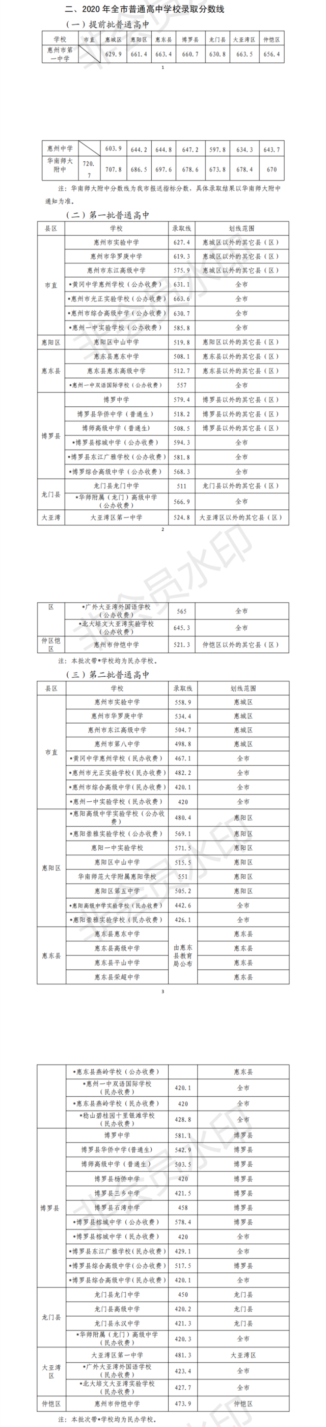 2020年惠州普通高中各批次錄取分?jǐn)?shù)