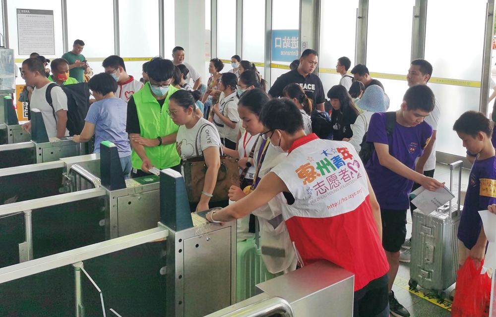 暑運(yùn)客流主要以學(xué)生出行流和返校流、旅游流、探親流為主,務(wù)工流、商務(wù)流為輔;學(xué)生及旅游流前期主要集中在長(zhǎng)沙、重慶、武漢、張家界及珠三角的城市區(qū)間流動(dòng)。預(yù)計(jì)暑運(yùn)期間惠州火車(chē)站發(fā)送旅客55.8萬(wàn)人次(日均發(fā)送9000人次),預(yù)計(jì)客流高峰日發(fā)送旅客可達(dá)到1.3萬(wàn)人次以上。隨著客流量的增加,對(duì)于志愿者的需求也越來(lái)越大。在惠州火車(chē)站隨處可見(jiàn)身穿紅、綠馬甲的志愿者們,他們無(wú)私奉獻(xiàn)時(shí)間和精力,為旅客提供各種幫助和服務(wù),在服務(wù)臺(tái)上指引旅客。