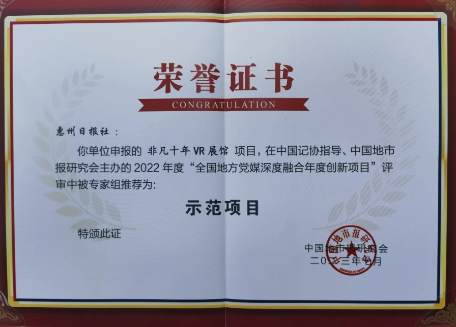 “惠州非凡十年”VR展館入選2022年度“全國地方黨媒深度融合年度創(chuàng)新項(xiàng)目”示范項(xiàng)目。該項(xiàng)目融合創(chuàng)新技術(shù),創(chuàng)新運(yùn)用VR技術(shù)打造云展館。以3D立體場景突破時(shí)間、地域、場地的局限,全方位展現(xiàn)惠州十年發(fā)展成就,更具互動(dòng)感、現(xiàn)場感,讓觀眾體驗(yàn)與互聯(lián)網(wǎng)技術(shù)的創(chuàng)新融合。