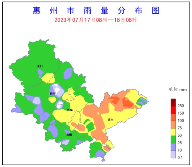 17日8時~18日8時,全市平均雨量43.2毫米,有2個站點錄得100~250毫米累積雨量,有48個站點錄得50~100毫米累積雨量,有71個站點錄得25~50毫米累積雨量,各縣區(qū)最大降水量分別為:惠東寶口107.9毫米、惠陽良井90.2毫米、惠城河南岸76毫米、龍門龍江59.5毫米、博羅泰美58.4毫米、仲愷惠環(huán)52.9毫米、大亞灣澳頭37.1毫米。