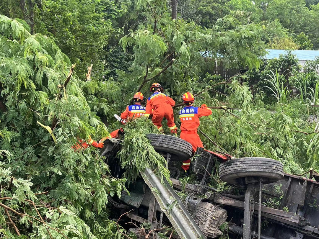 通過喊話溝通了解,被困人員只有一名,意識(shí)清醒但無法自行脫困。車頭部分被樹木阻礙,人員難以通行。指揮員立即評(píng)估救援方案,利用機(jī)動(dòng)鏈鋸對(duì)車頭左側(cè)門上方障礙物進(jìn)行破拆開辟救助通道,營救被困人員。