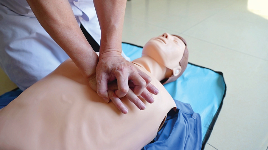 如果溺水者有脈搏,則給予6秒1次的人工呼吸。如果溺水者沒(méi)有反應(yīng),頸動(dòng)脈搏動(dòng)消失,沒(méi)有呼吸,判斷為心跳呼吸驟停,立即讓溺水者仰臥于堅(jiān)硬的平面(地面),解開上衣,暴露前胸,然后立即進(jìn)行胸外心臟按壓。