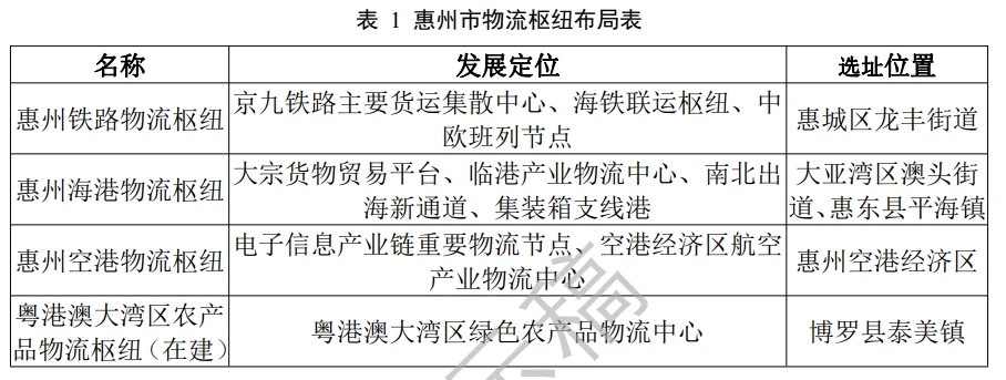 根據(jù)研究方案,惠州鐵路物流樞紐定位為京九鐵路主要貨運(yùn)集散中心、海鐵聯(lián)運(yùn)樞紐、中歐班列節(jié)點(diǎn)。惠州海港物流樞紐定位為大宗貨物貿(mào)易平臺(tái)、臨港產(chǎn)業(yè)物流中心、南北出海新通道、集裝箱支線港。惠州空港物流樞紐定位為電子信息產(chǎn)業(yè)鏈重要物流節(jié)點(diǎn)、空港經(jīng)濟(jì)區(qū)航空產(chǎn)業(yè)物流中心。粵港澳大灣區(qū)農(nóng)產(chǎn)品物流樞紐定位為粵港澳大灣區(qū)綠色農(nóng)產(chǎn)品物流中心。