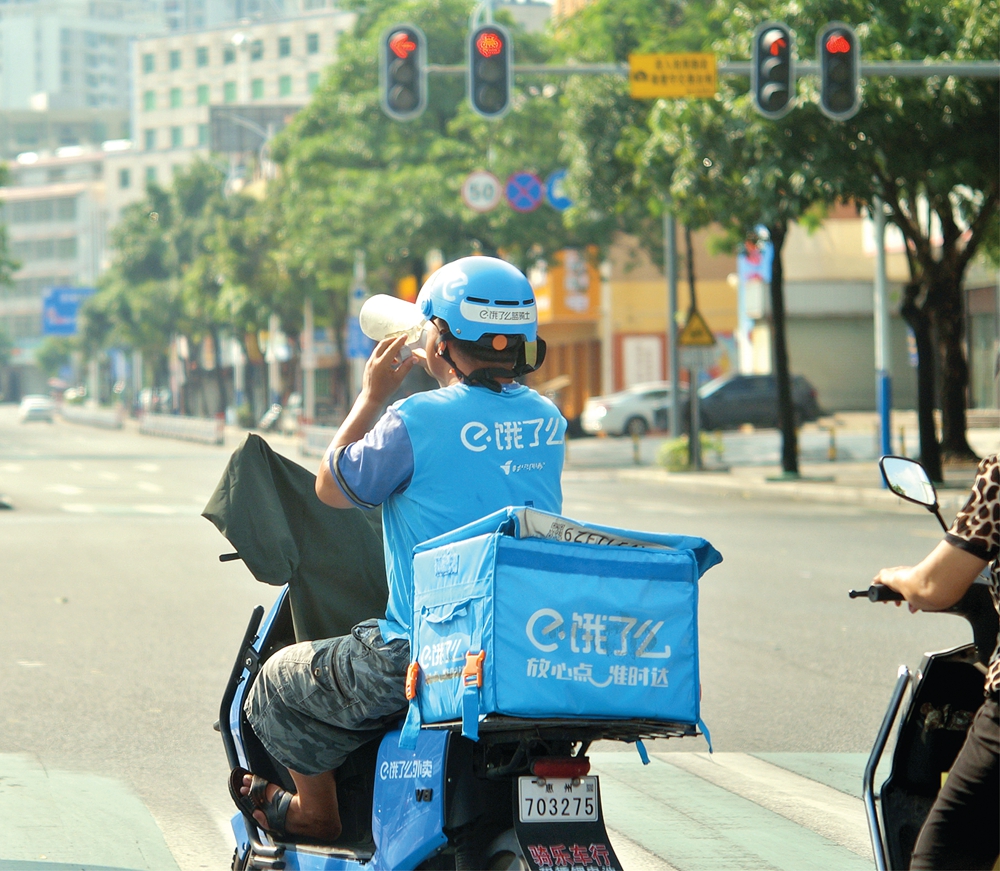 外賣小哥在等紅綠燈的間隙大口喝水。