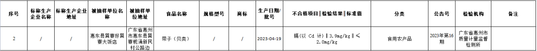 惠東縣巽寮好巽寮大飯店使用的帶子(貝類),鎘(以 Cd 計)不符合食品安全國家標準規(guī)定。檢驗機構(gòu)為廣東省惠州市質(zhì)量計量監(jiān)督檢測所。