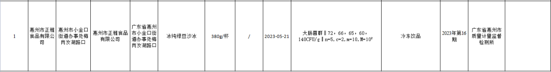 惠州市正雅食品有限公司生產(chǎn)的冰純綠豆沙冰,大腸菌群不符合食品安全國家標準規(guī)定。檢驗機構(gòu)為廣東省惠州市質(zhì)量計量監(jiān)督檢測所。
