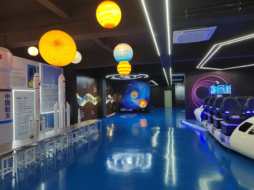 該園區(qū)主要分為三大版塊,文創(chuàng)辦公中心、科技研學中心、文化傳媒空間。尤其是由印刷車間改造而成的科技教育體驗中心,擁有國防教育、人工智能、自然科學、航天航空等主題研學活動基地,在這里,可以看到1:1仿造的天宮二號,體驗5D影院的炫目科技,動手探索科學的奧秘等,既能開眼界、漲知識,又能收獲趣味,今年6月開放,為青少年研學、科普教育帶來了豐富的體驗感。