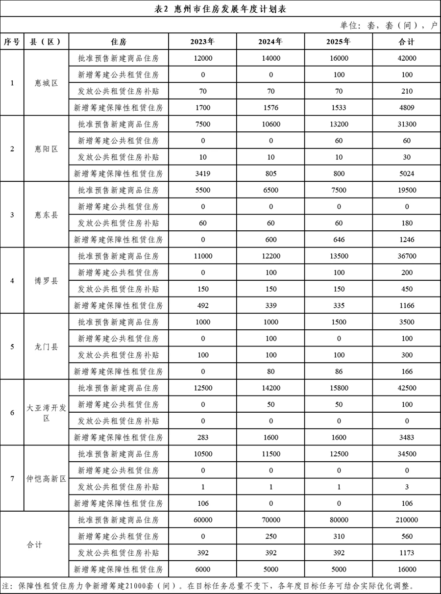 在住房保障層面,2023-2025年,惠州市新增籌建公共租賃住房560套,發(fā)放租賃補(bǔ)貼1173戶,新增籌建保障性租賃住房不少于1.6萬套(間),力爭達(dá)到2.1萬套(間);住房公積金新開戶職工人數(shù)34.25萬人,住房公積金新增繳存額170.86億元,推進(jìn)住房保障擴(kuò)面提質(zhì),惠及更多新市民、青年人。