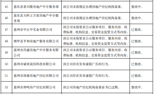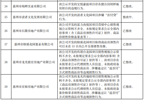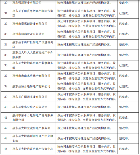 關(guān)注被通報(bào)的29家惠州企業(yè)名單,分別為惠州市讀者文化發(fā)展有限公司、惠州市龍光駿宏房地產(chǎn)有限公司等6家房地產(chǎn)開發(fā)企業(yè)和惠東強(qiáng)晟置業(yè)有限公司、惠州市泰惠誠(chéng)置業(yè)有限公司、惠州市斌哥說房科技有限公司等23家房地產(chǎn)中介機(jī)構(gòu)。