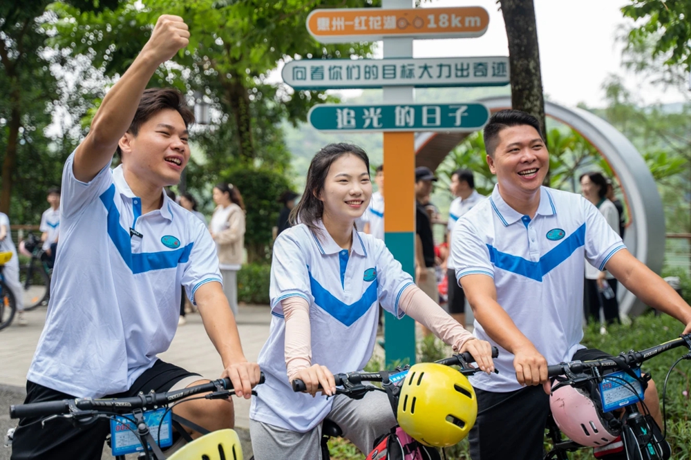參加活動(dòng)的人員在《追光的日子》紅花湖綠道打卡點(diǎn)開展拍攝、撿跑及騎行活動(dòng)。惠州日?qǐng)?bào)記者譚琳 攝