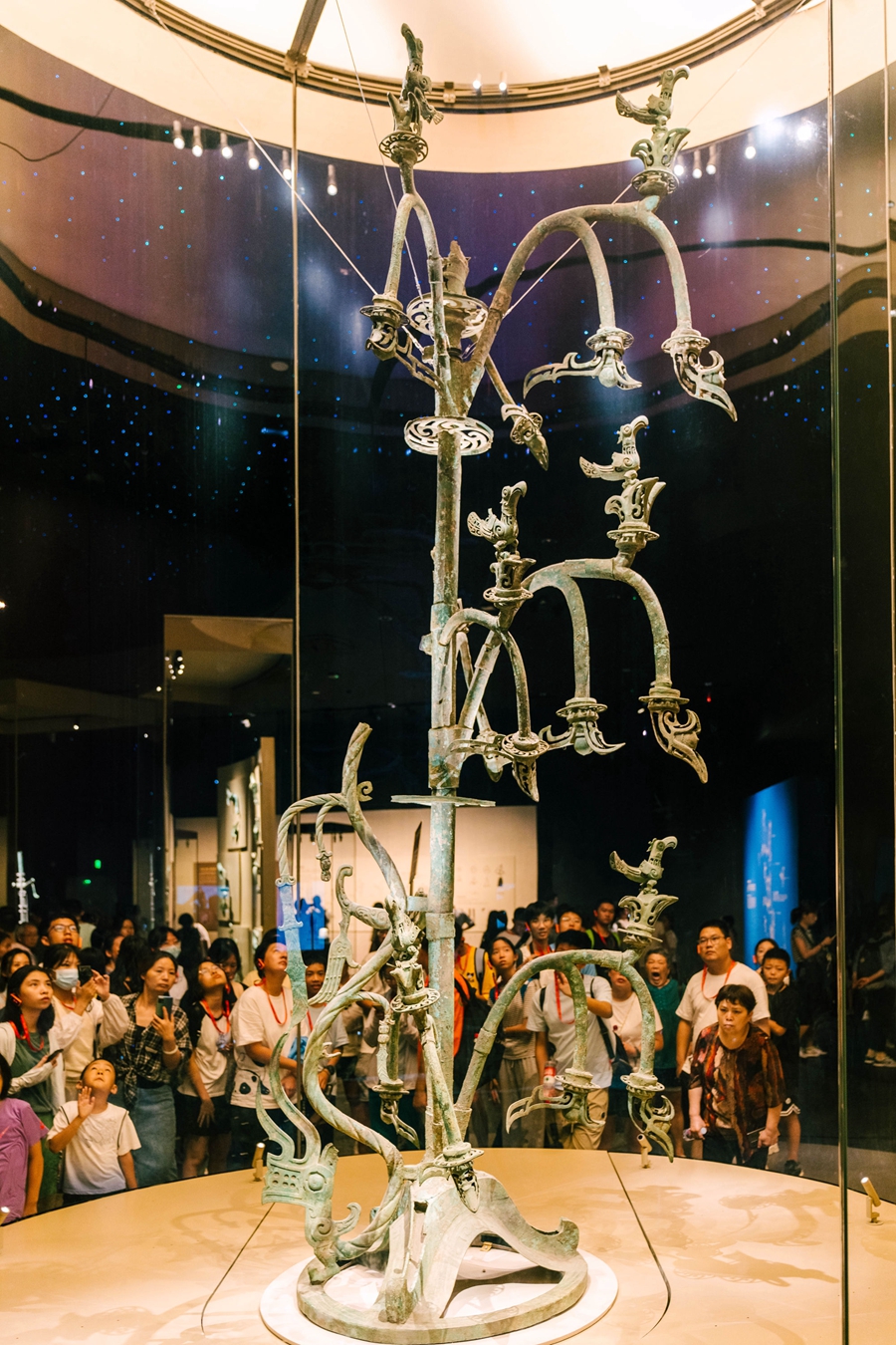 館內大量應用數(shù)字化技術與科技融合技術,將歷史與未來相結合。以騎獸頂尊人像為例,便是由出自二號坑的銅尊口沿、出自三號坑的銅頂尊跪坐人像和出自八號坑的銅神獸組合而成。科研人員利用新科技手段,用三星堆8個“祭祀坑”出土的青銅器,還原了3000年前的“奇妙組合”,如此既滿足文物安全穩(wěn)定的展出需求,又讓觀眾能一睹文物的奇特與精美。